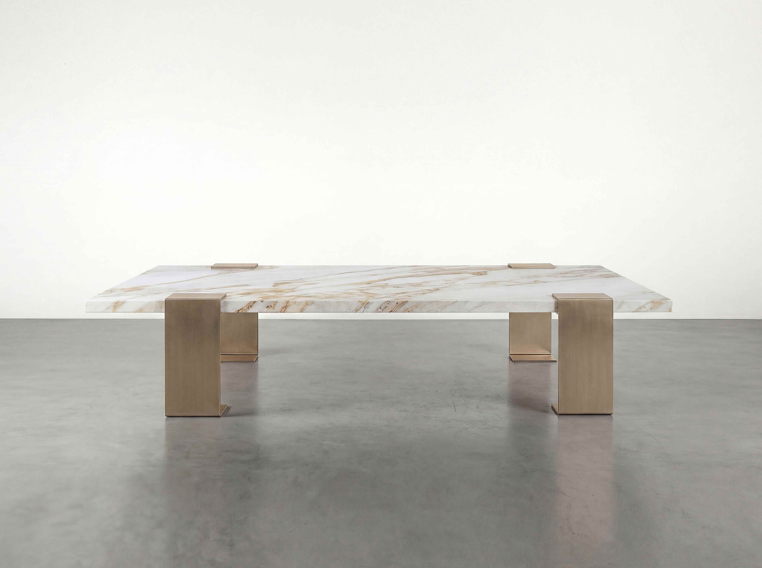 Classic moderne coffee table, available in metal patinas base base or sculptural cast metal liquid, top in marble, glass or wood