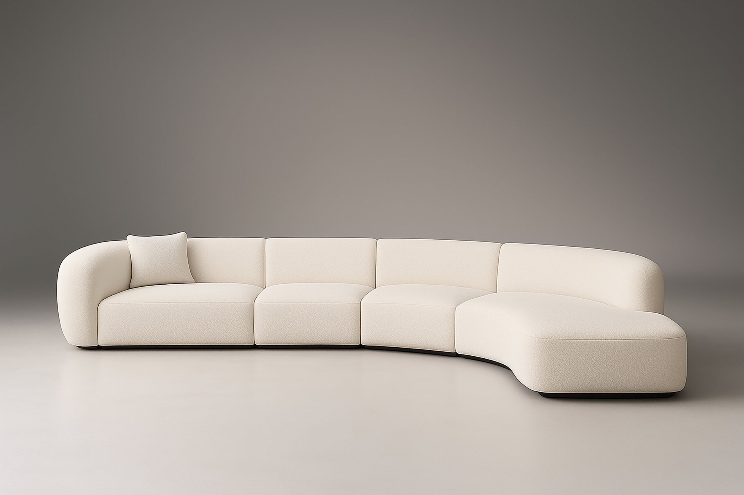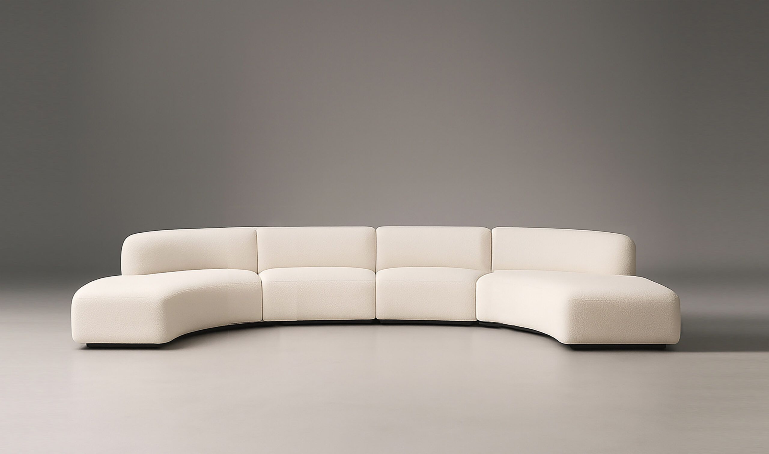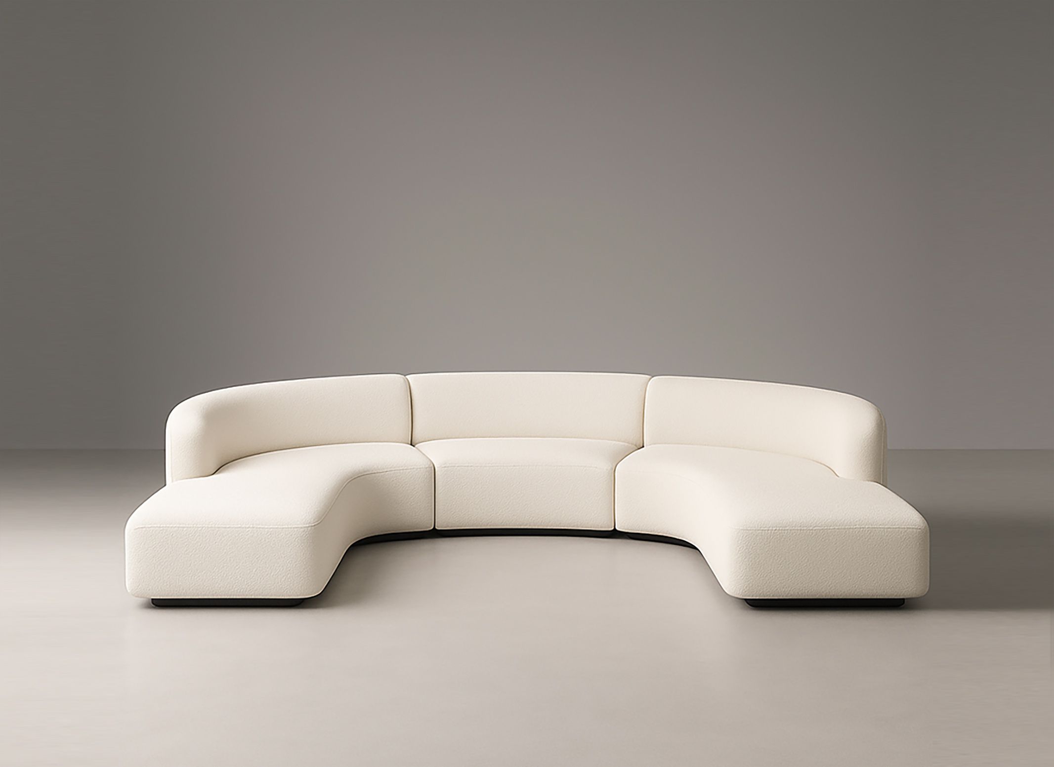 With Its silhouette embraces a sweeping, rounded form that feels both contemporary and inviting, balancing fluid curvature with tailored precision. With sculptural elegance and refined detailing, it rests on a Liquid Metal patina base. Offered in both a standard configuration and a modular system, it adapts easily to a variety of layouts while maintaining its modern, timeless presence