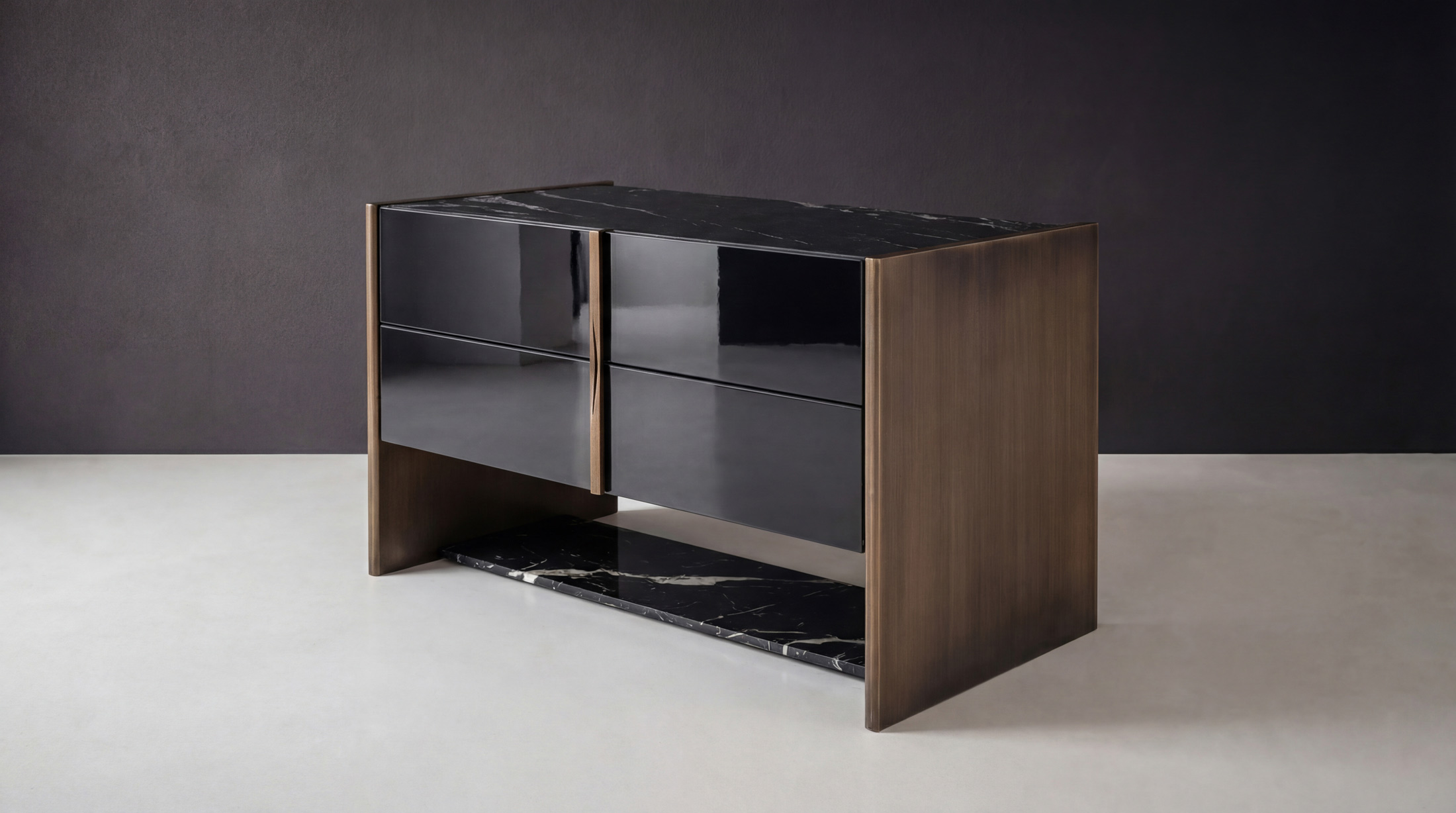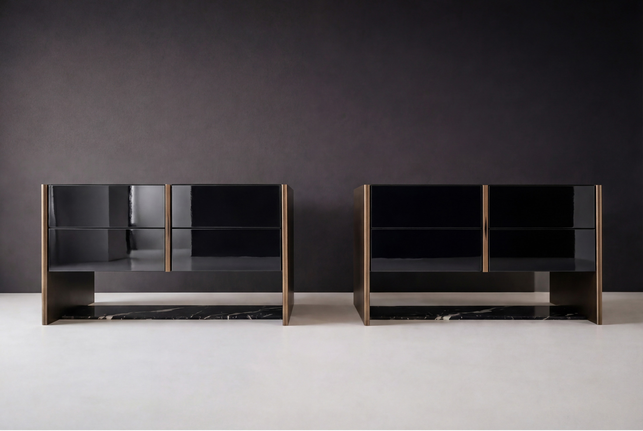 Indulge in luxury with our rich nightstand, a harmonious blend of exceptional finishes. The solid metal patina sets the stage for opulence, while laser-cut decorative handles add a touch of intricate elegance. The interiors and door, available in a special metal liquid lacquer or wood, offer a personalized touch. It’s the details that make this piece truly memorable and undeniably unique. Elevate your bedroom with sophistication and style.