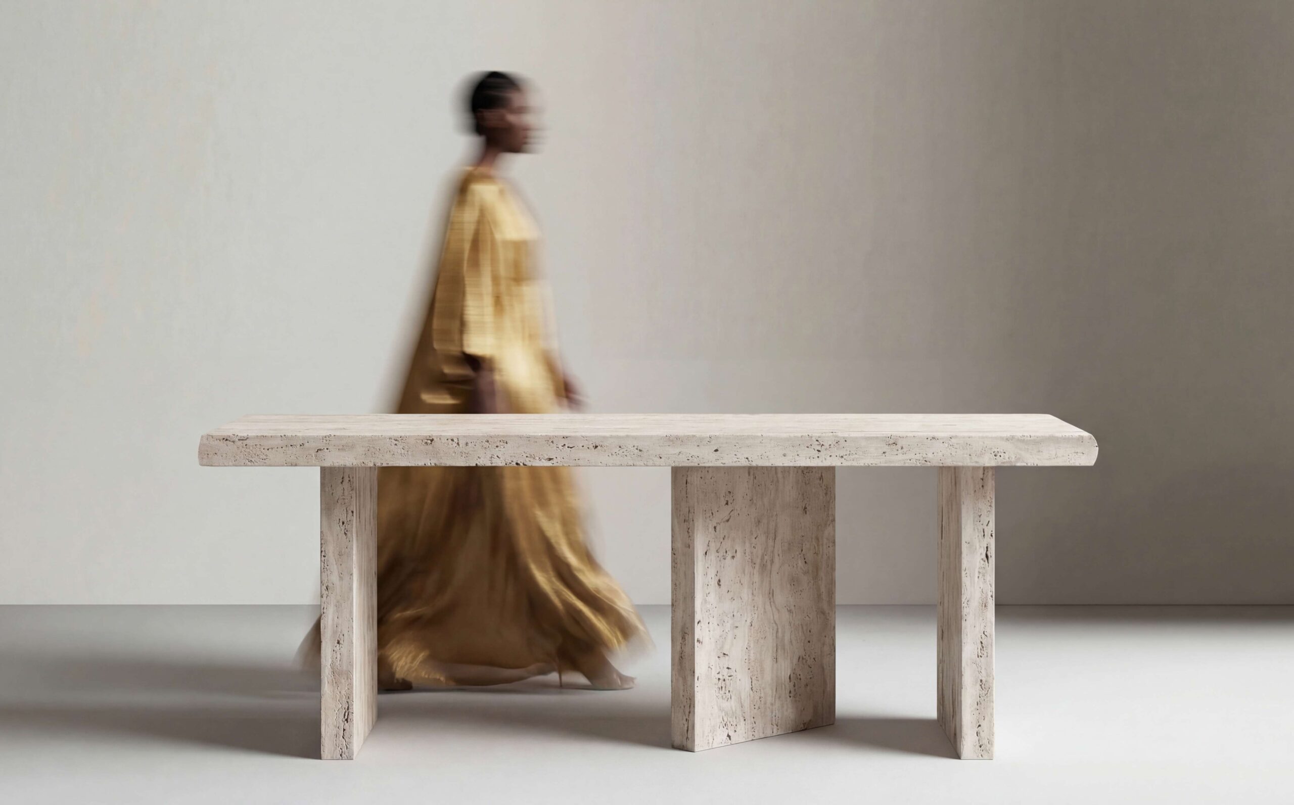 The Urbe Console celebrates the organic beauty of travertine, with rich tonal variations and a minimalist, grounded form. Defined by its monolithic silhouette, it rests on three asymmetrical legs that create a subtle interplay of light and shadow. Its sculptural profile feels both ancient and modern—rooted in timeless material yet elevated by contemporary minimalism, bringing natural sophistication to entryways and living spaces.