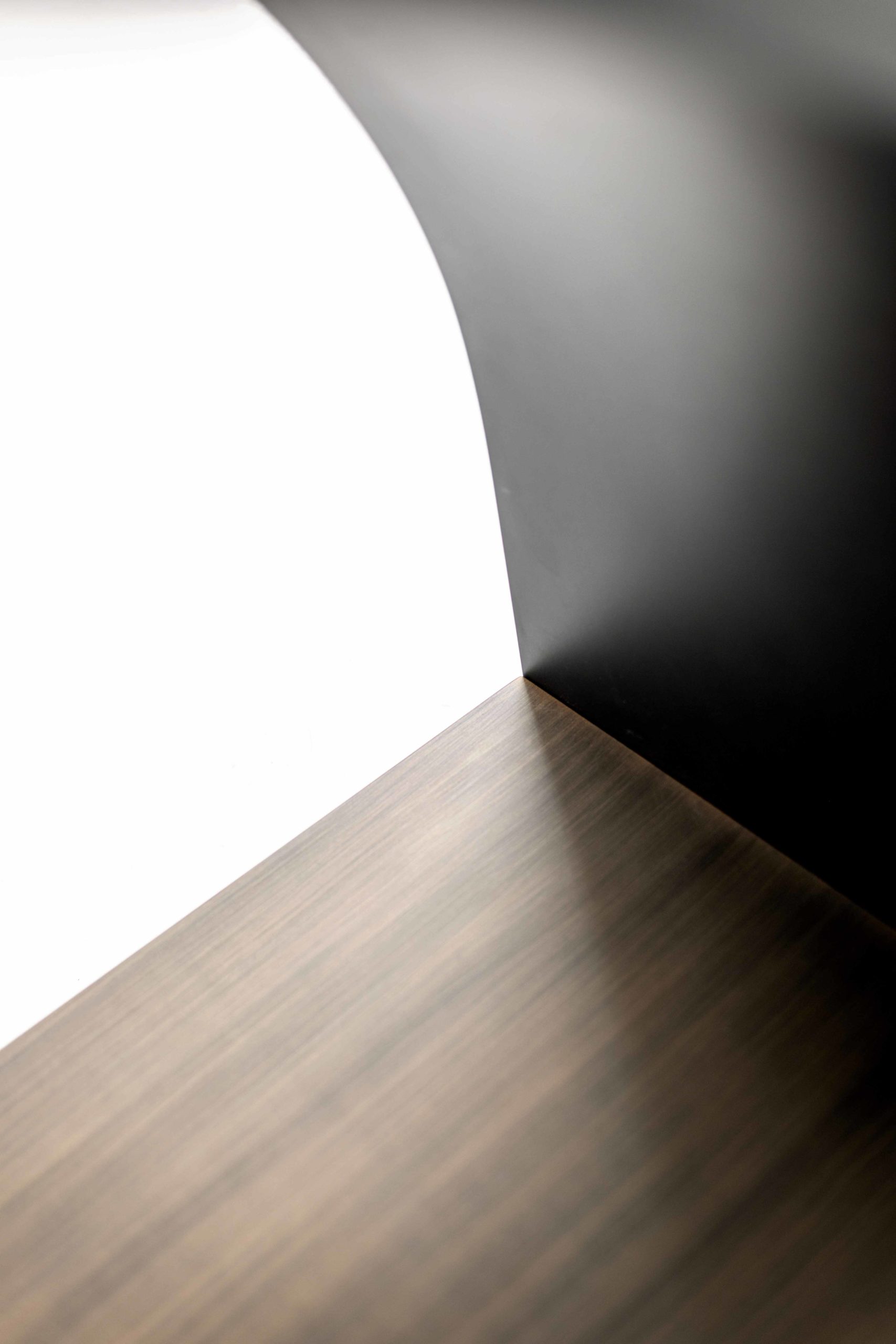 Finished in liquid metal lacquer or wood, creating a piece that combines soft geometry with a refined and contemporary presence.