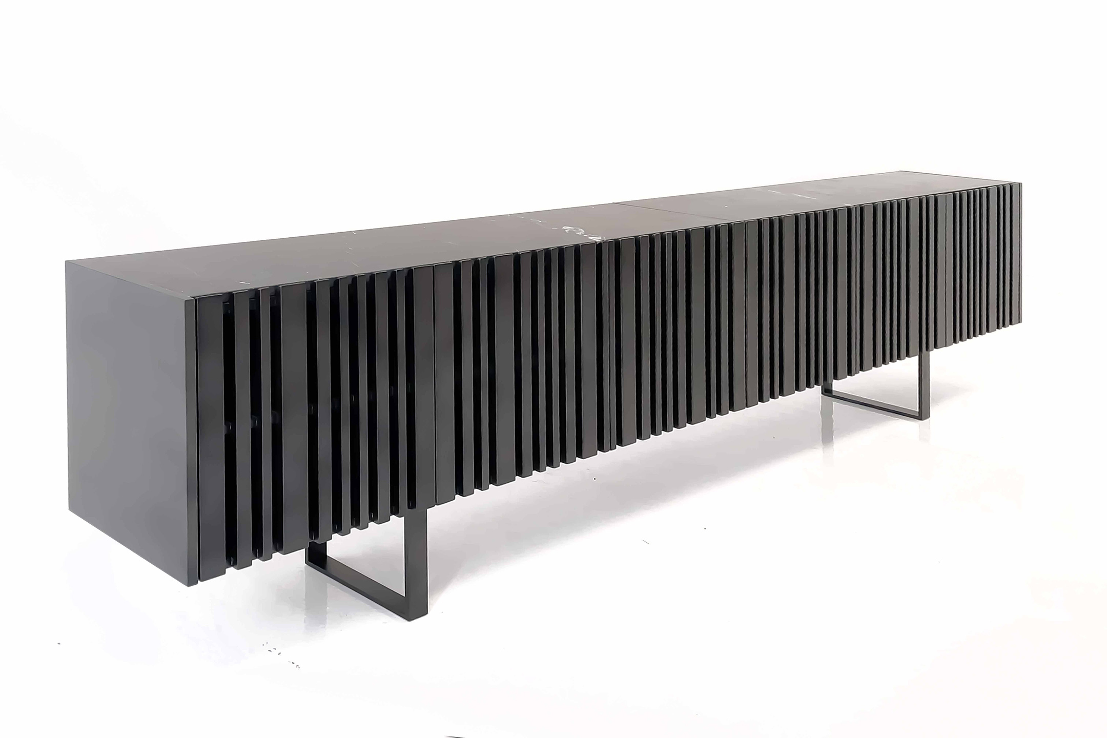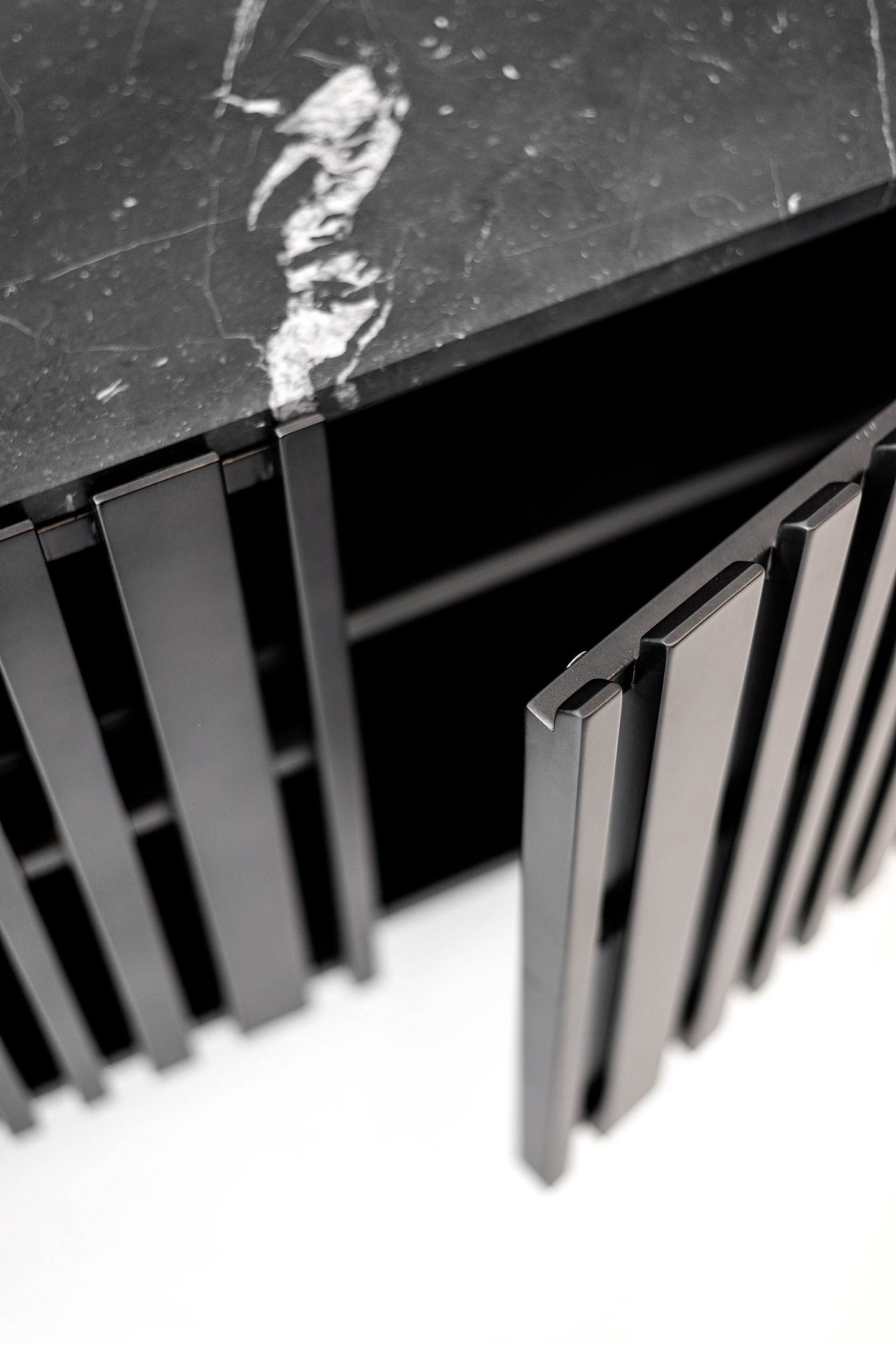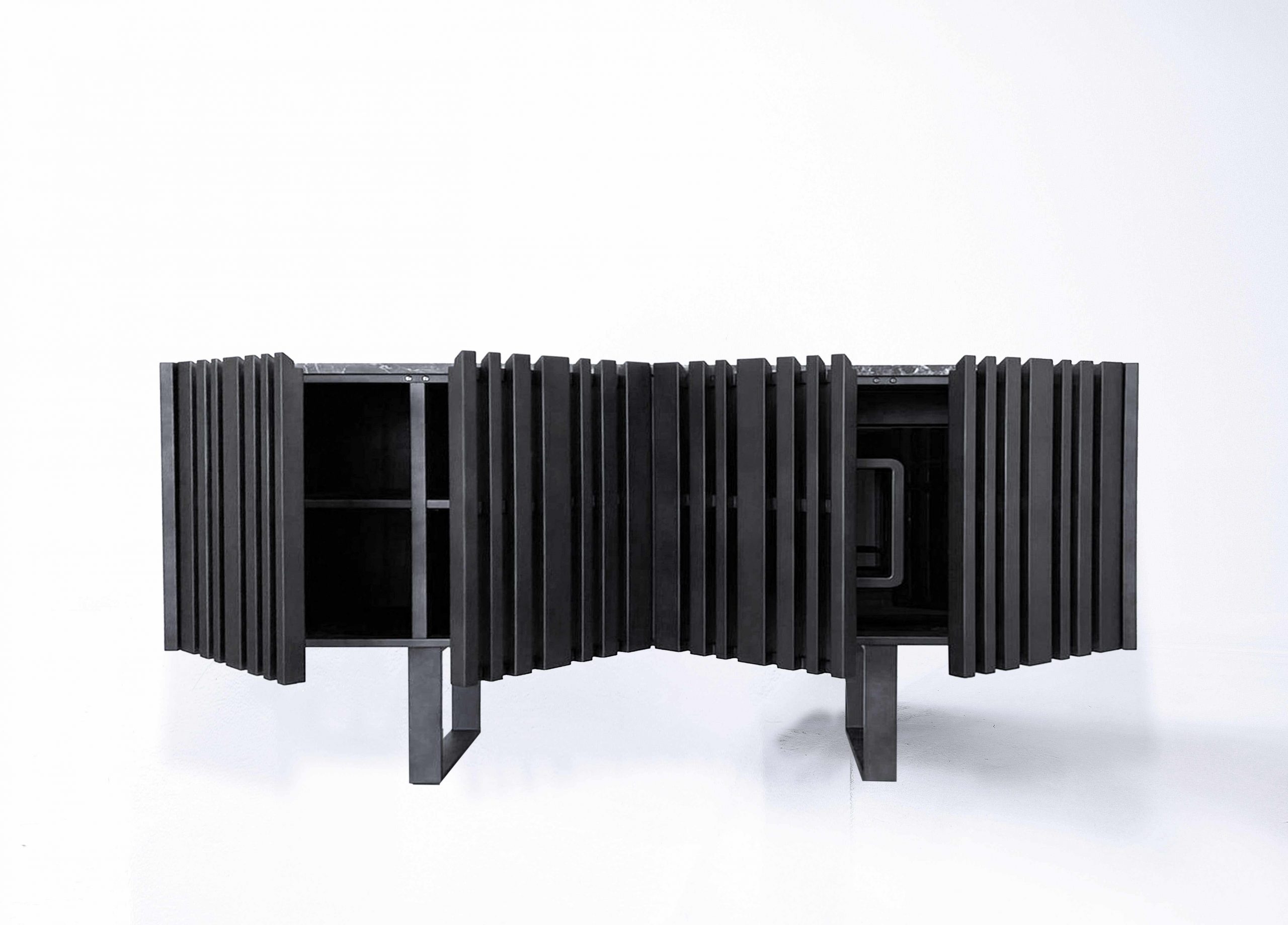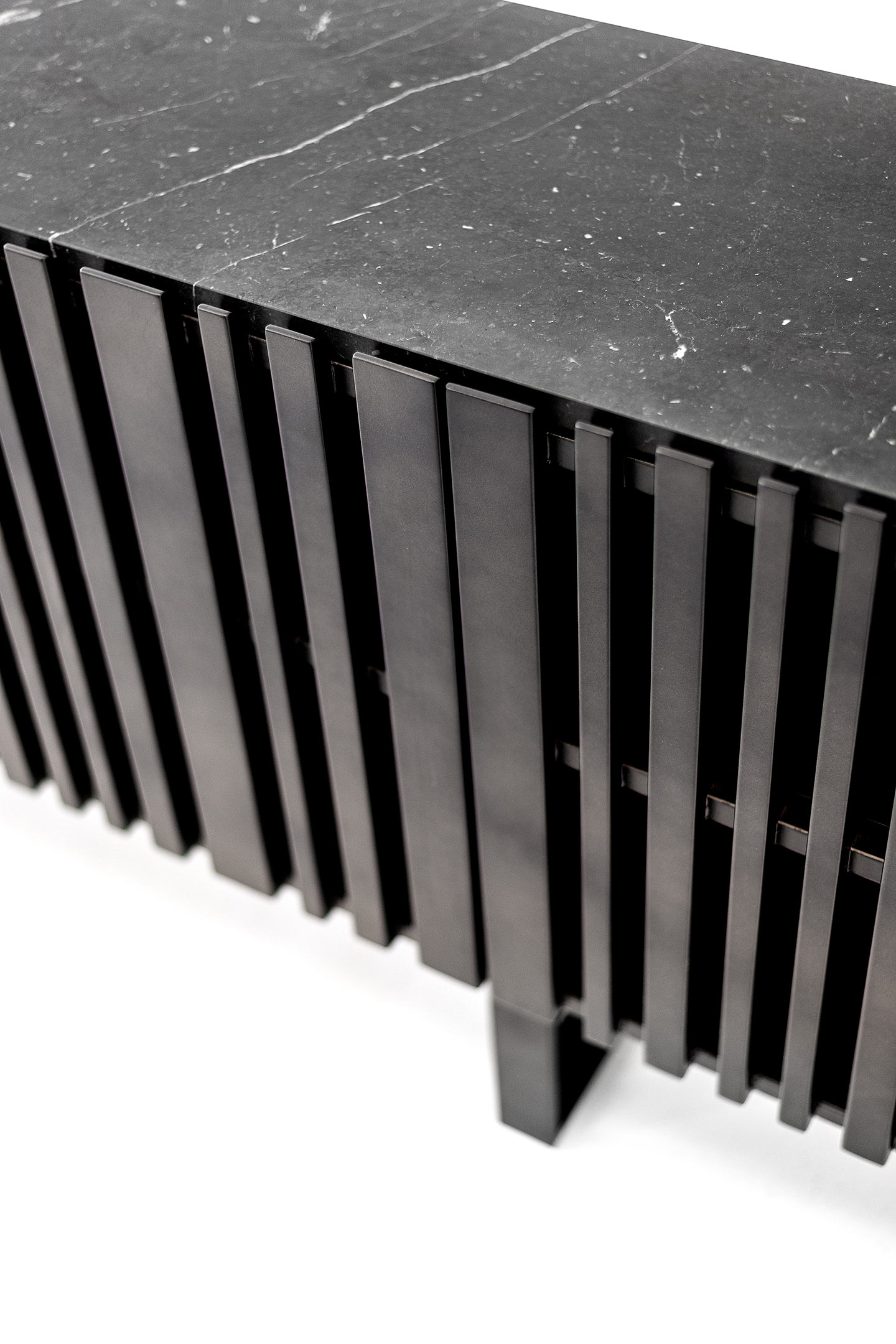 Brutalist credenza, perfect to house media equipment and sound system, legs in metal patinas , doors and frame in metal liquid lacquer or wood, top in marble