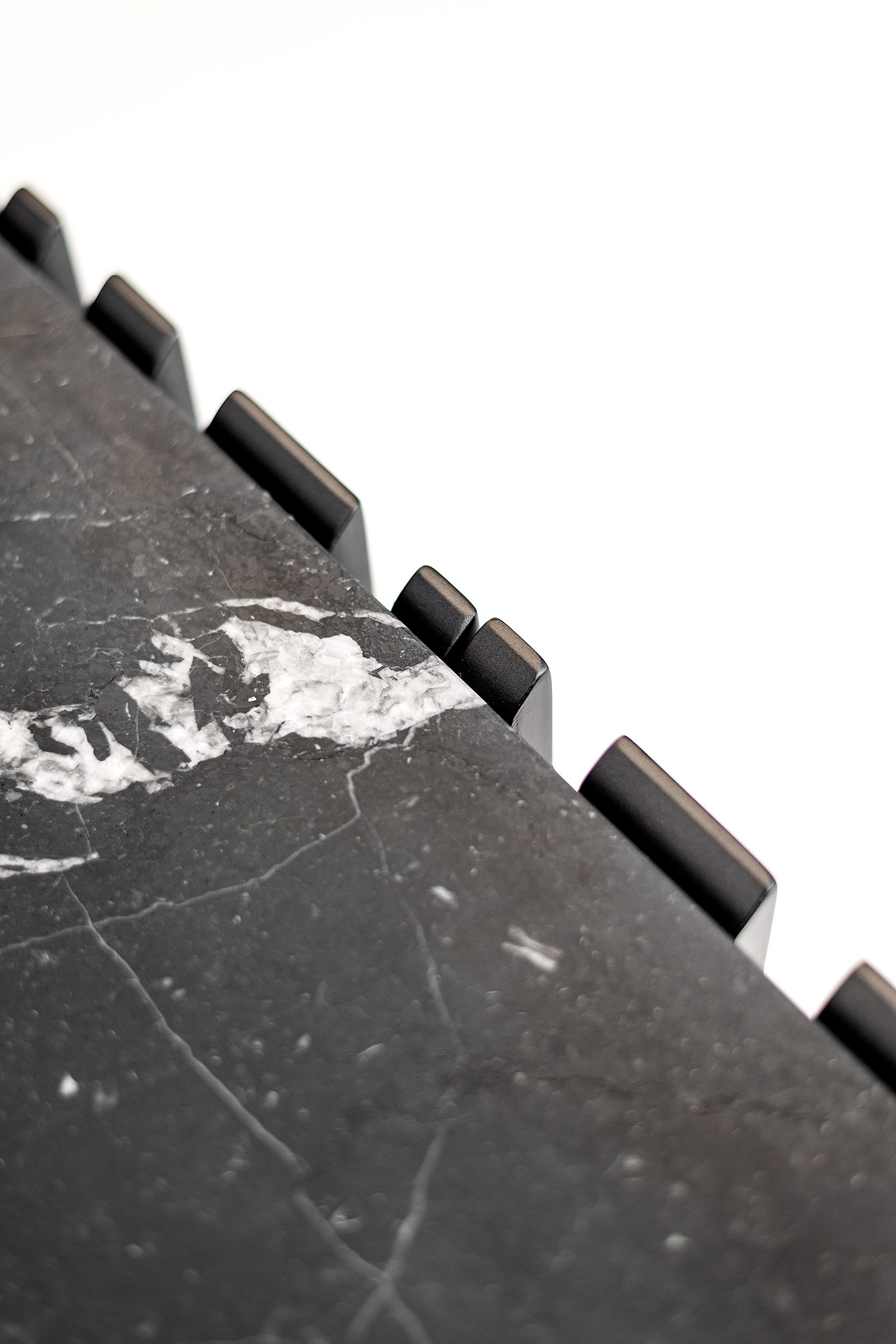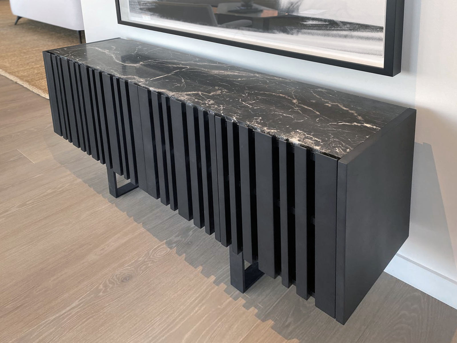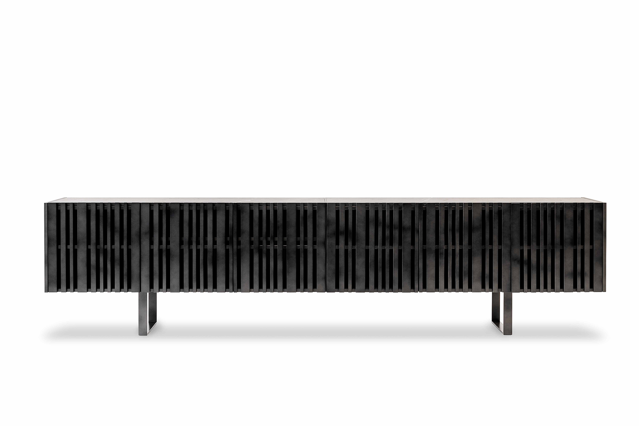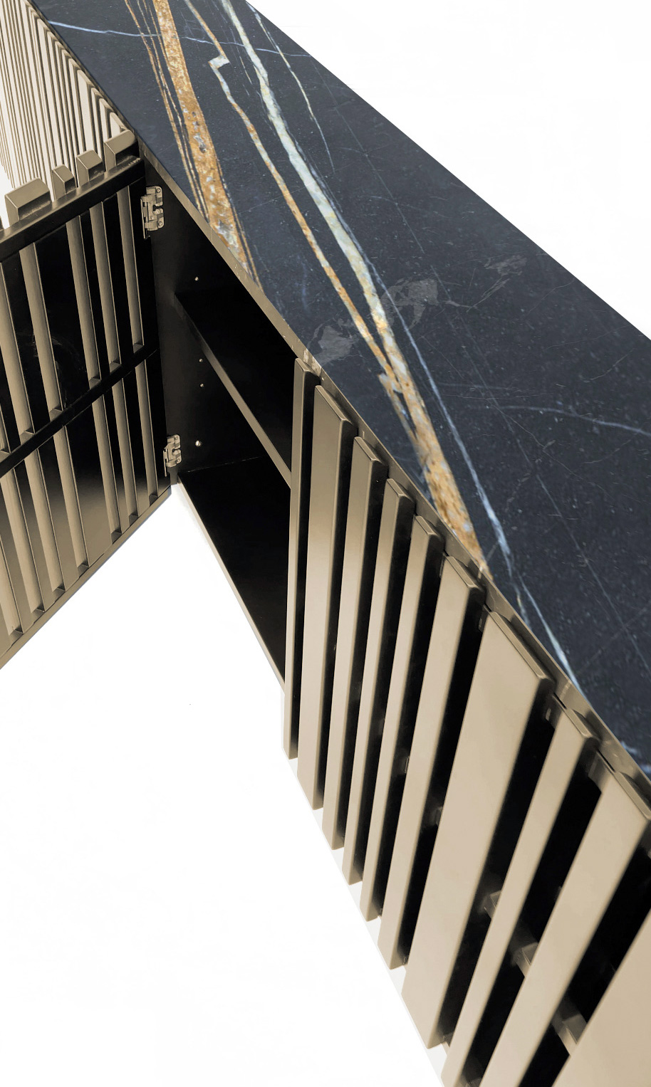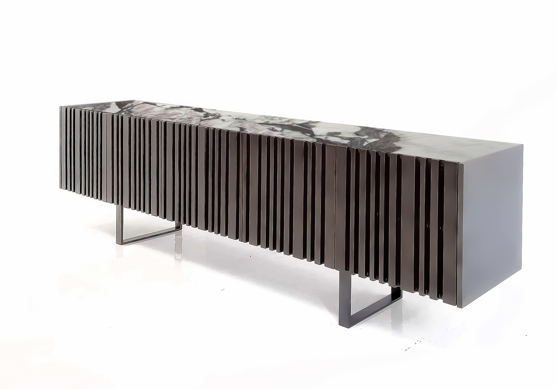 Brutalist credenza, perfect to house media equipment and sound system, legs in metal patinas , doors and frame in metal liquid lacquer or wood, top in marble