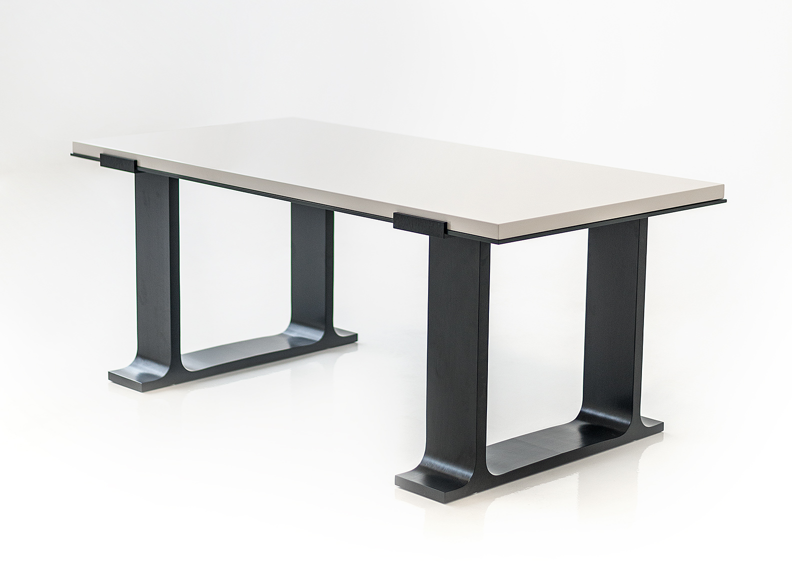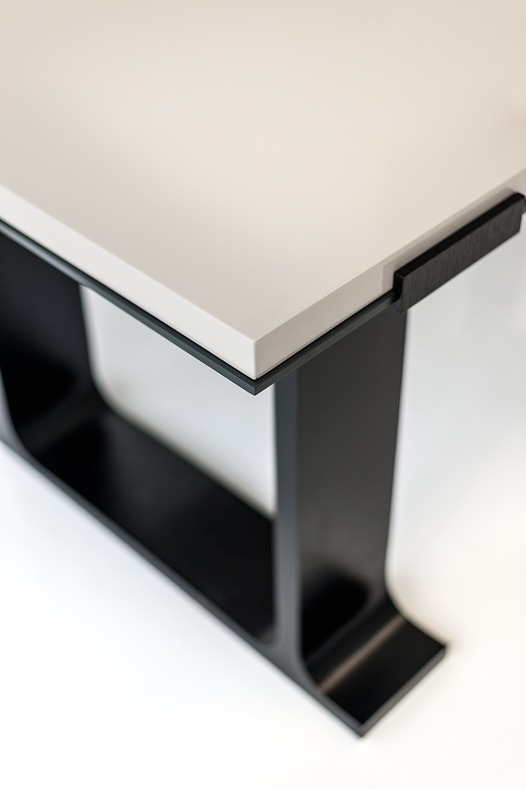 Desk/ with top in lacquer or italian Coach hide, black metal plate under top, base in European oak. Now also available with 2 drawers